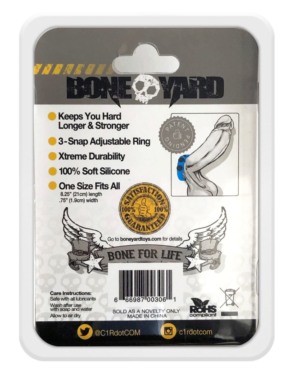 The powerful and iconic Boneyard-branded design has a sleek soft touch silicone finish and features a superior and durable stretch. The medical grade 100% silicone snap rings come with 3 snaps on one end and 2 on the other giving the wearer 4 sizing options to find the correct size.