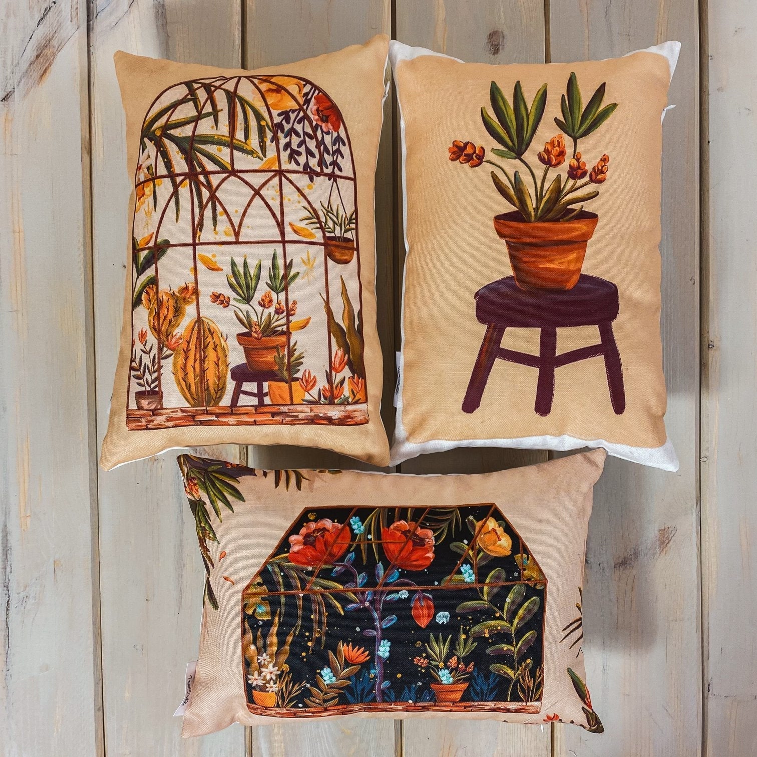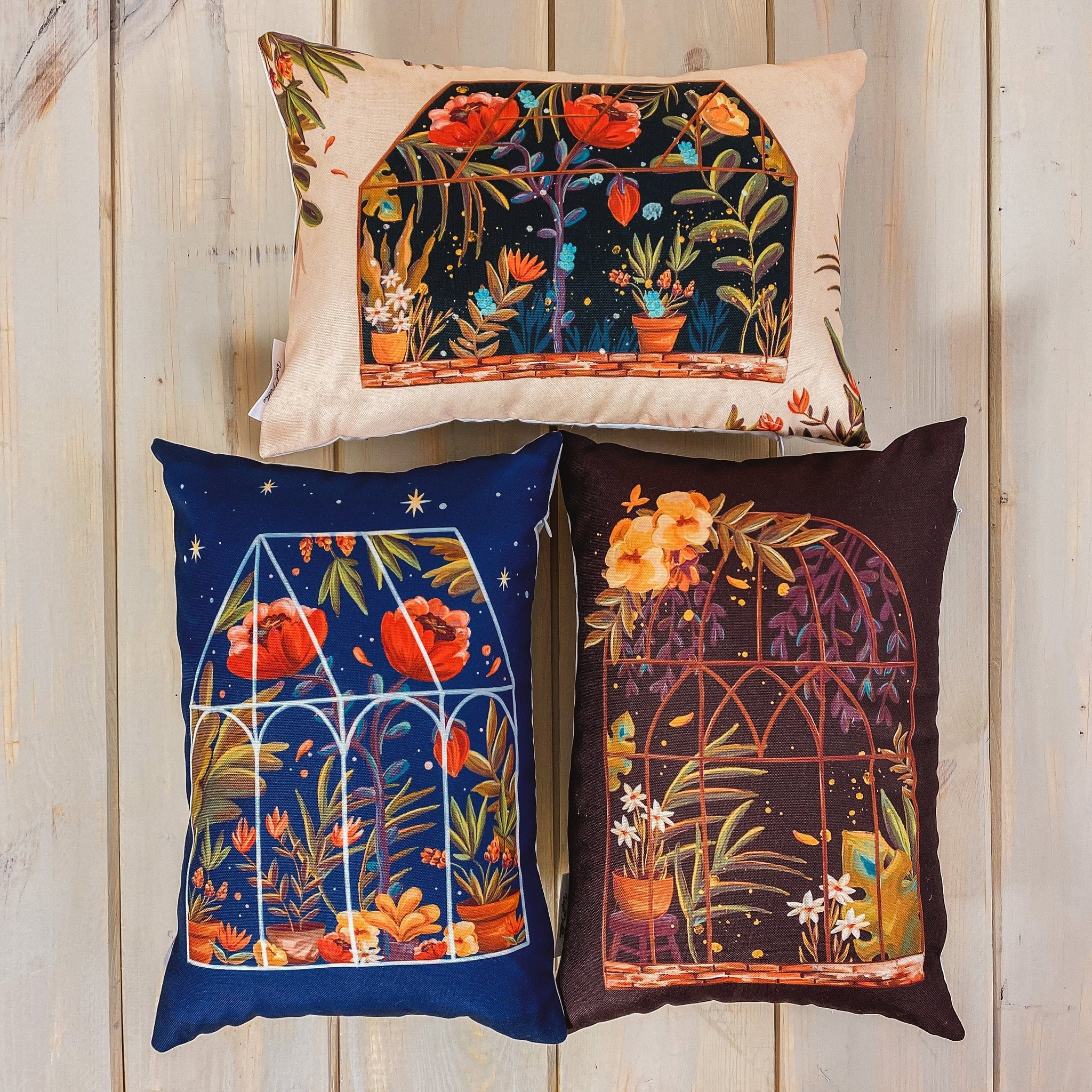 Our beautiful Greenhouse collection features pillows of many different colors to match your display. This pillow collection has been designed with numerous color combos for different rooms but can also be printed on a white background. Simple designs with rich colors, gorgeous planted flowers, and greenhouses.