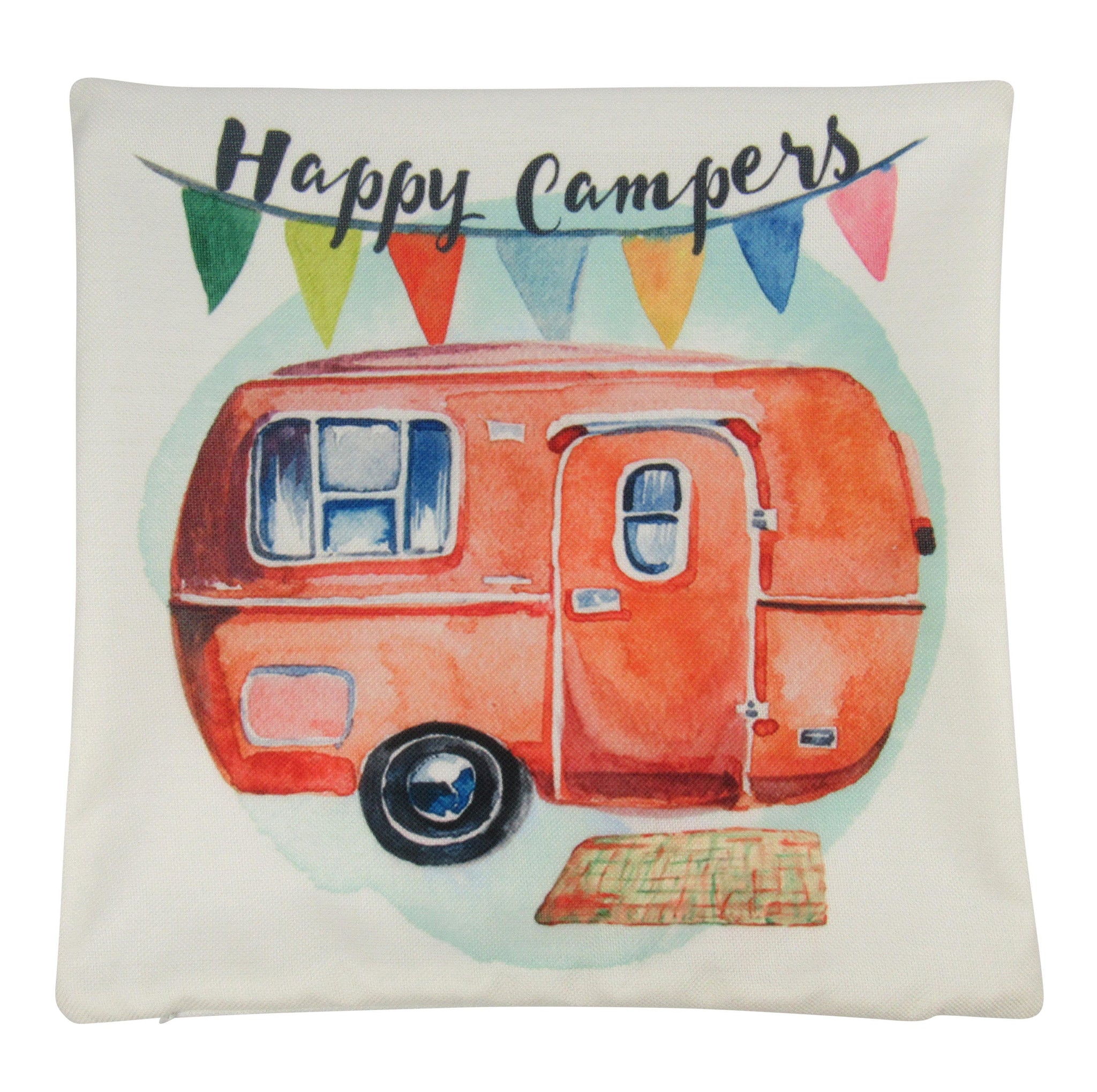 What a fun pillow for an RV or trailer! Happy Campers in an adorable red camper trailer on a contrasting White Background.