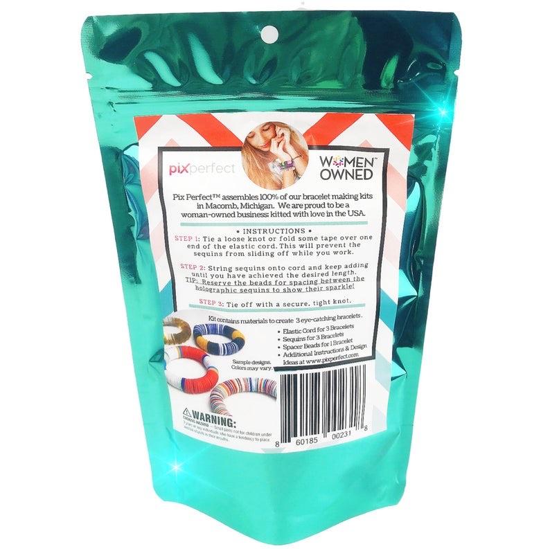Each kit contains the materials to create 3 eye-catching bracelets featuring our unique Pix Perfect™ sequins. This kit is the perfect craft for girls 8+, but stylish enough for teens and adult women. Simply string the sequins onto the elastic cord and keep adding until you have achieved the desired length. Note: Each kit includes our special holographic/iridescent sequins; reserve the beads for spacing between the holographic sequins to really show off their sparkle.