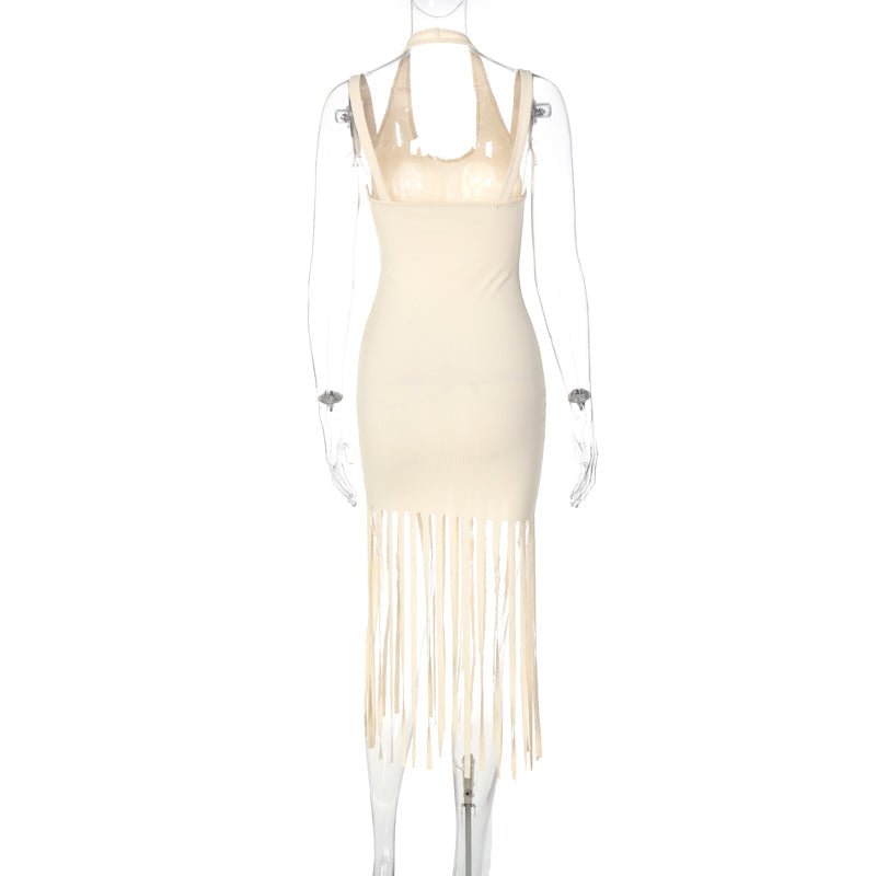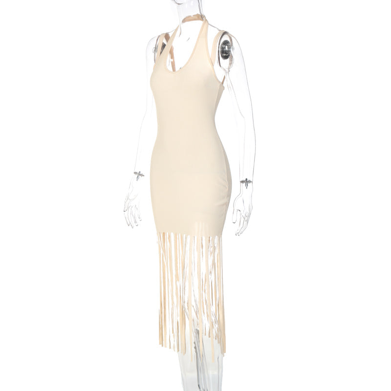 Women Ribbed Tassel Sexy Sleeveless Backless Halter Bodycon Midi Dress