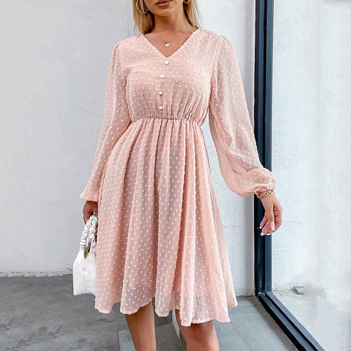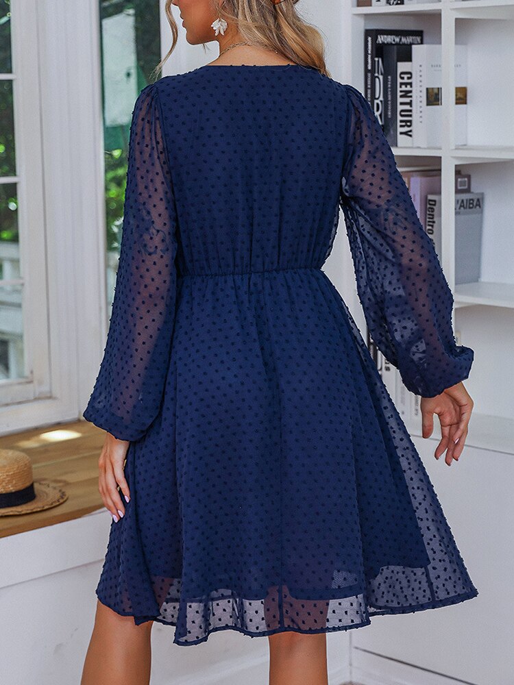 Navy Blue Polka Dot Button V Neck Transparent Dress