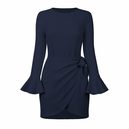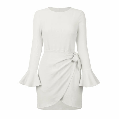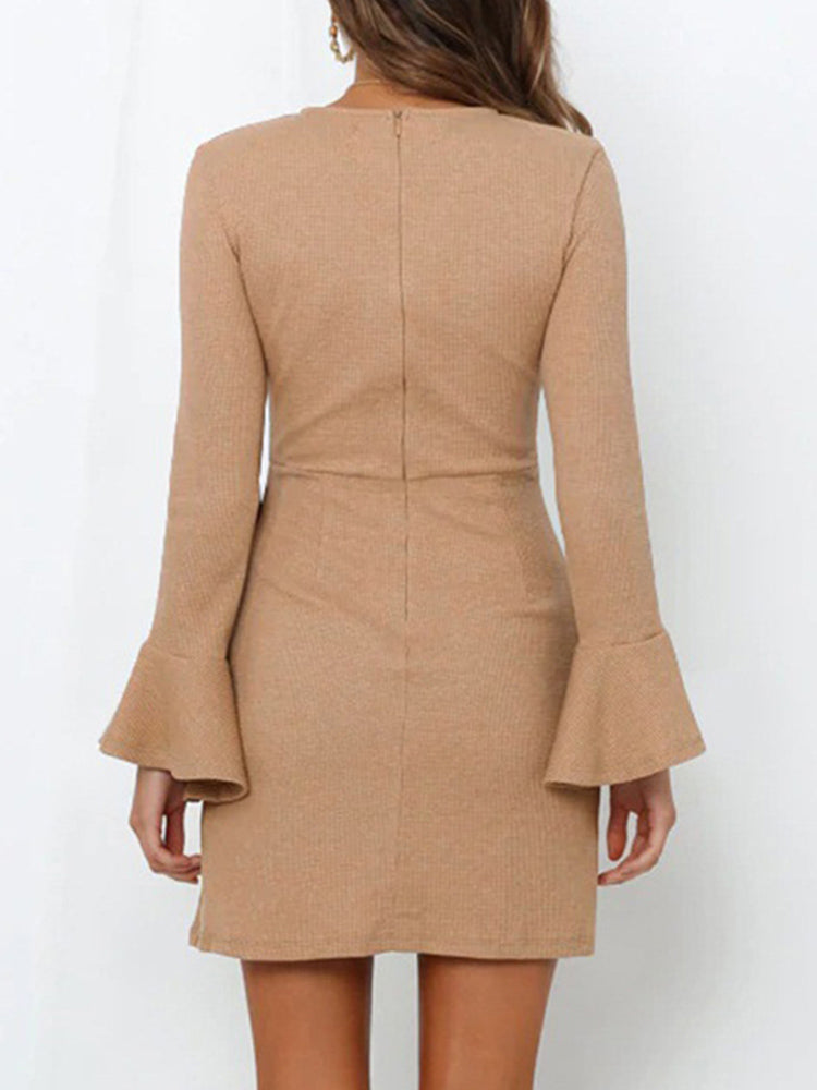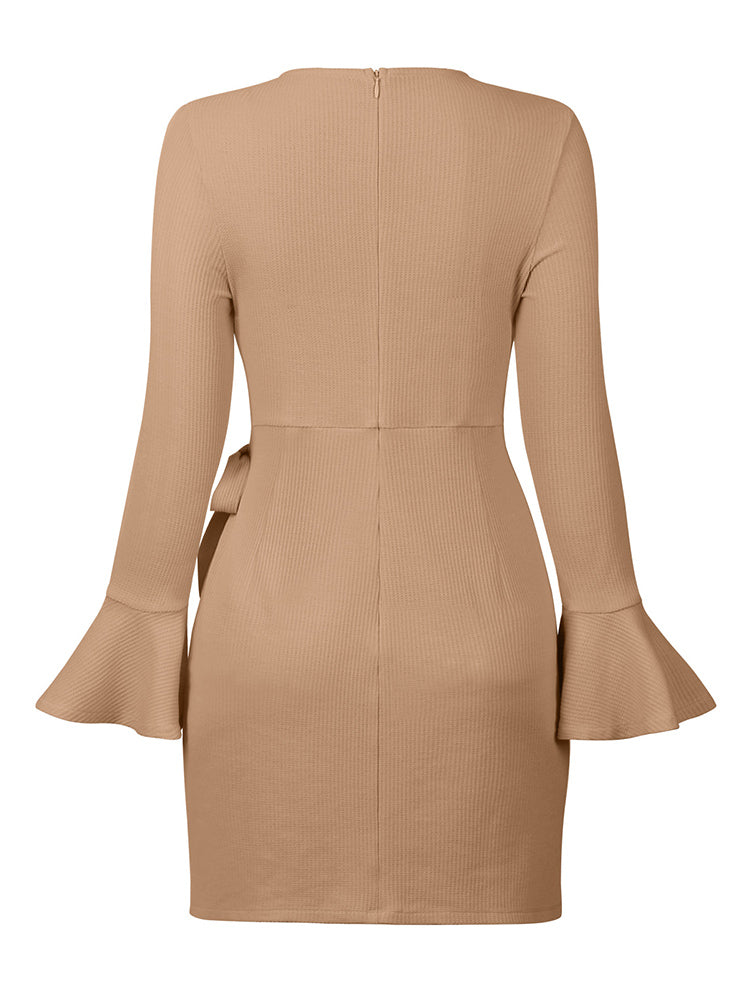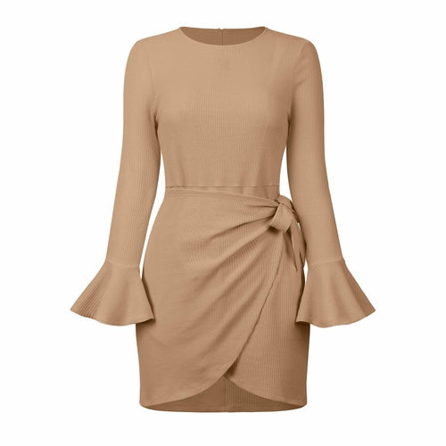 O Neck Knitted Khaki Bowknot Flare Sleeve Bodycon Women Dress