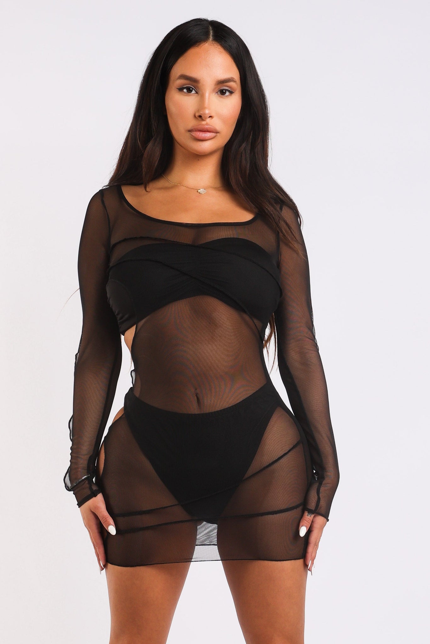 Sexy Cut Out Detailed Long Sleeve Mesh Sheer Dress BLACK