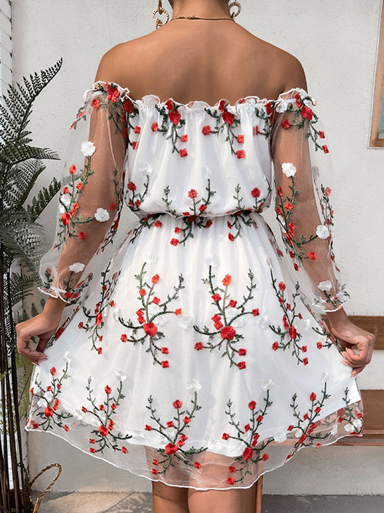 Elegant Embroidery Print See-through Mesh Mini Dress