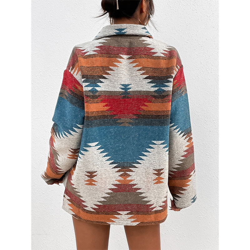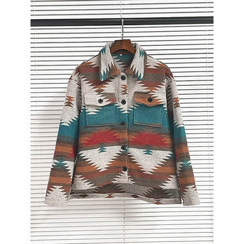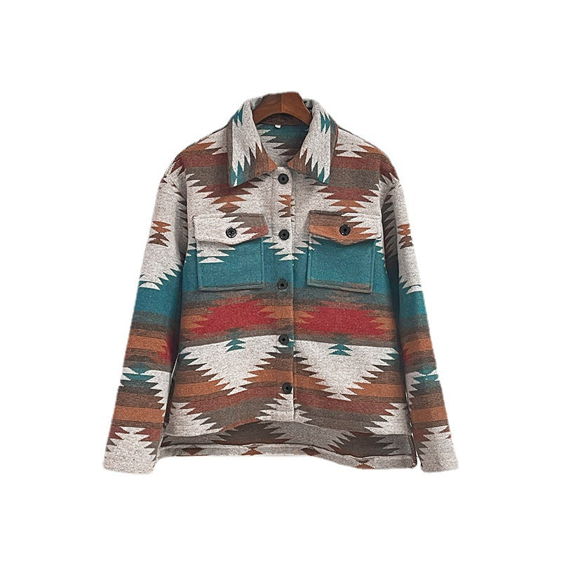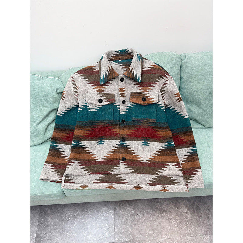 Geometric Jacquard Woolen Coat with Notched Lapel