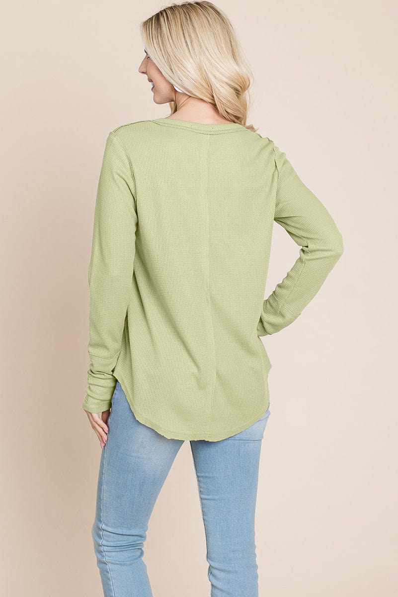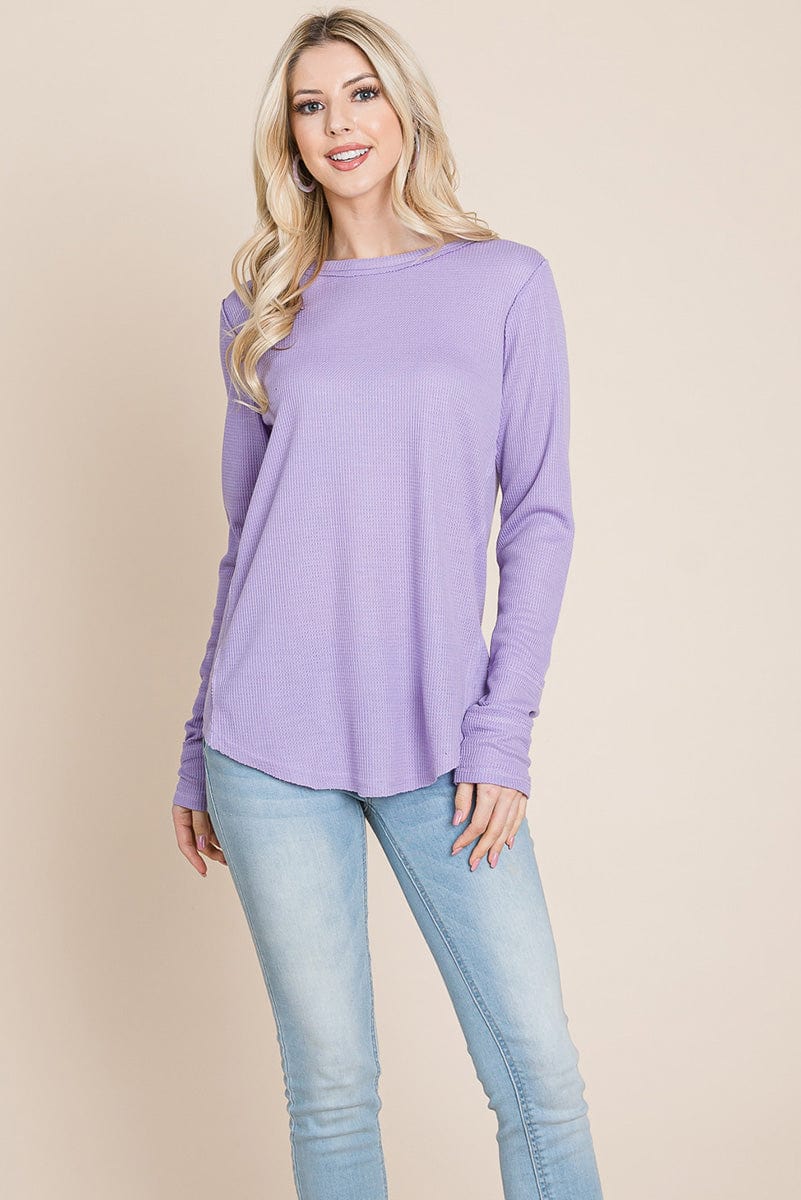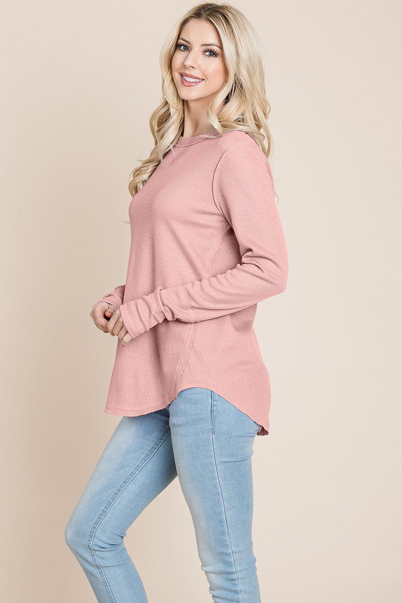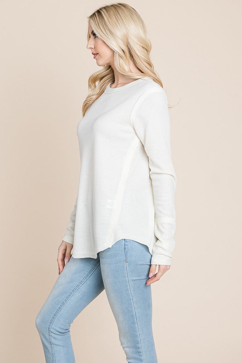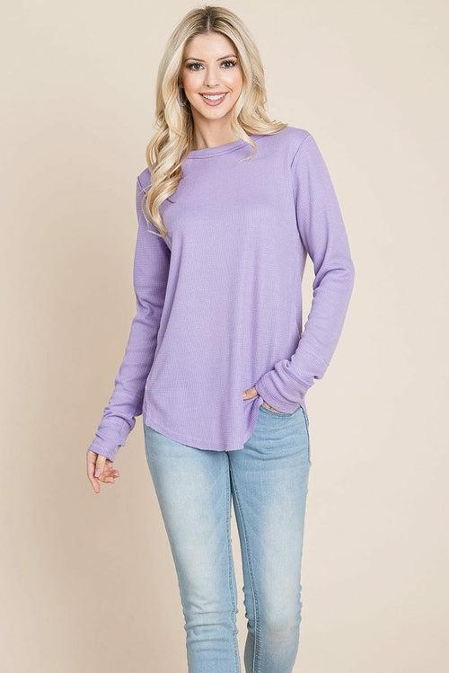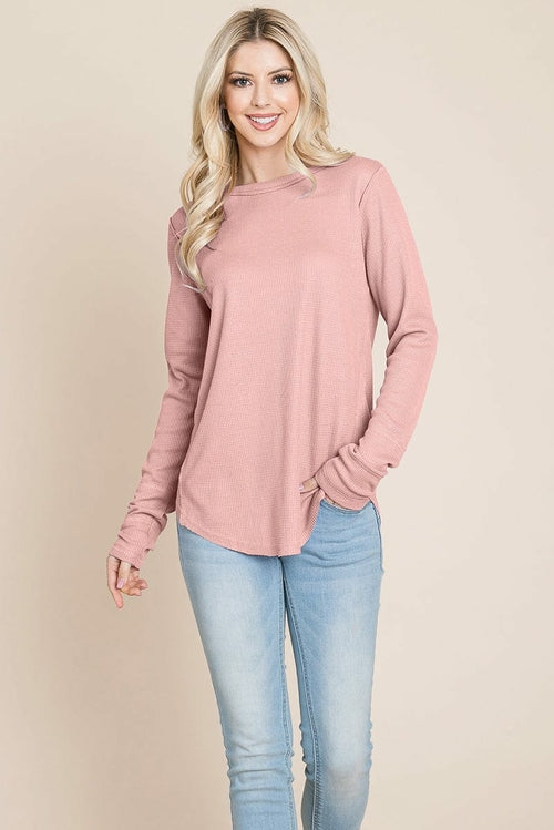 Features: Long Sleeve, Crew Neck, Raw Edge Style, Layered sleeve detail, Soft and Comfy Waffle Knit material, Pullover