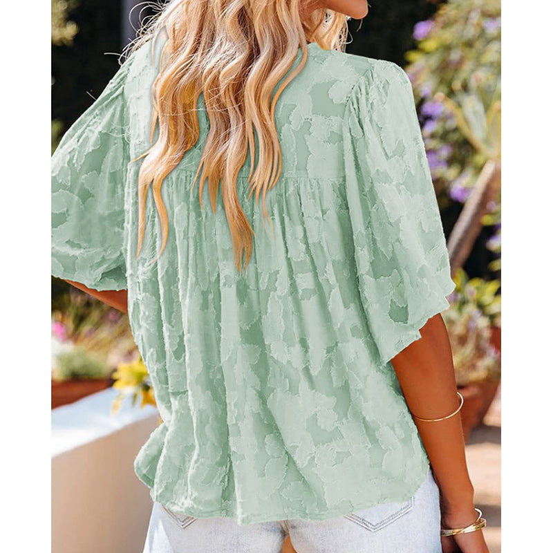 V-Neck Floral Texture Flare Half Sleeve Loose Chiffon Pullover
